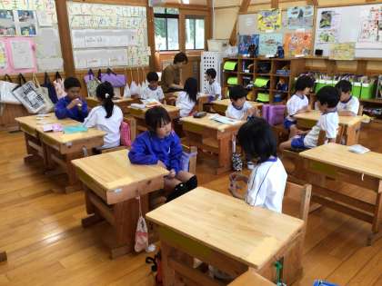 1年生は、算数の時間に計算カードを使ってたし算の学習をしました。二人組になって、解き合いました。おや、先生も一緒になって解いていますよ。