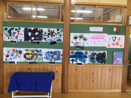 1年生の教室の前に新しい図工作品が掲示されました。元気いっぱいの作品がたくさん並んでいます。