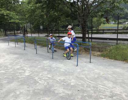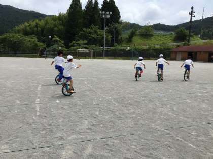 子どもたちが一輪車で遊んでいます。子どもたちは、競い合ったり、互いに教え合ったりしていました。1年生の子たちがみるみる上達してびっくりしました。