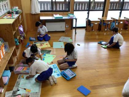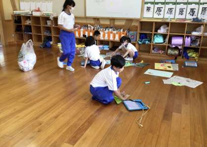 子どもたちは、教室の床の上で、のびのびと製作活動をしています。