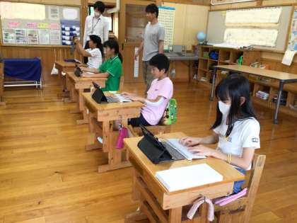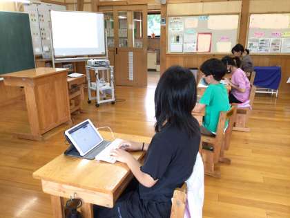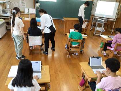 ホームポジションを覚えよう、という学習課題でした。ホームポジションとは、キーボードに指を置いて、迷わず早くキーを押していくスキルです。こういったタイピング技能は、コンピュータを使う基本となります。コツは、両手の親指をスペースキーに置いて他の指を動かすのだそうです。