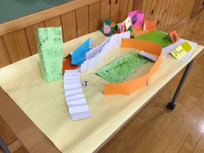 1年生の「いろいろな世界」が完成しました。紙を折ってしっかりと立っています。立体的な作品を協働して作り上げました。