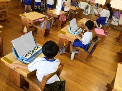 1年生の教室では、朝の支度をしたり、鍵盤ハーモニカの練習をしたりしていました。