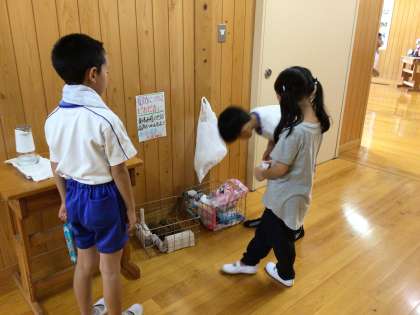 夏休み前に、学校をきれいにしようと掃除強調週間を設定しました。この期間は、普段より便利なお掃除グッズを揃えました。それを使って玄関の窓ガラスをきれいにしました。