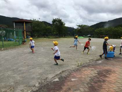 シャボン玉を作る子、空に浮かんだシャボン玉を追いかける子。みんなで楽しんでいました。