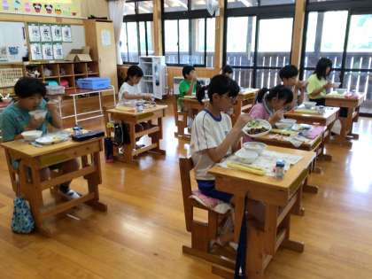 ご飯、たなばたじる、レバーとカボチャの甘辛煮、チーズサラダ、アセロラゼリー、牛乳です。