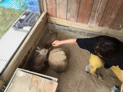 今日も、当番の先生がウサギのくるみのお世話をしました。先生が近づくと、くるみが寄ってきました。