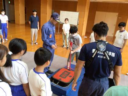 写真は、5年生と6年生が、屋外消火栓の蓋のあけ方を教えてもらい、実際にその重さを体感している様子です。子どもたちは、ずっしりとした重みに驚いていました。