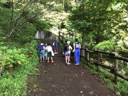 スクールバスから降りると、班長さんが並ぶように声をかけ、アジサイ坂をのぼっていきました。