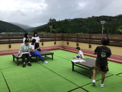ここは図書室のベランダです。子どもたちと先生が一緒に過ごしていました。クラスや家でのことを話したり、本を読んだりしました。学年や男女問わず仲良しで、ほほえましいです。