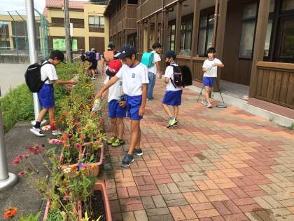 この取組は、特色ある学校づくり推進事業の予算で購入した花の苗を育て、学校に潤いをもたせようというものです。子どもたちにとって朝一番の活動です。