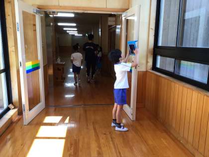 子どもたちが先生と一緒に、タブレットで写真を撮っていました。