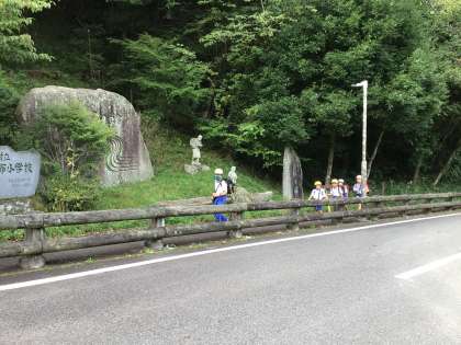 子どもたちがアジサイ坂の下を歩いてやって来ました。