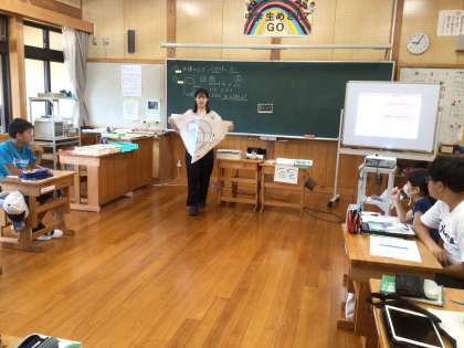 2年生は、算数の問題に班で話し合いながら取り組んでいます。6年生も算数ですが、先生が何やら大きな図形を提示しています。みんな興味津々な様子で聞いています。