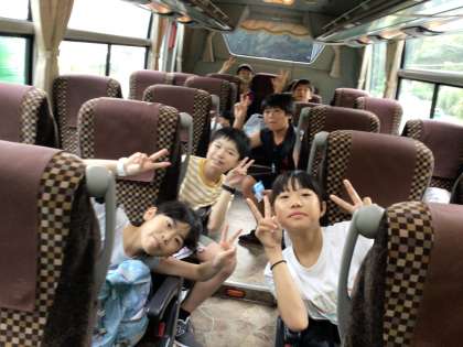 バスの様子です。 もうじき高速道路です。 お菓子の話題で盛り上がっています。