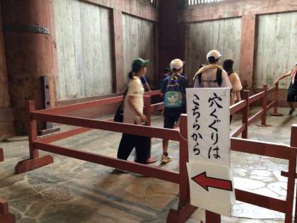 そして、柱の穴くぐり。大仏さまの鼻の穴と同じ大きさの穴が柱にあり、そこをくぐると、厄除け、無病息災、祈願成就といった御利益があるそうです。さあ、どうでしょうか。