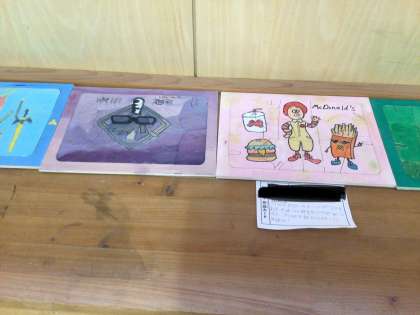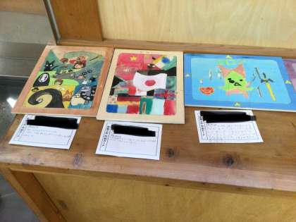5年生の教室の前に図工作品が展示されていました。ベニア板を糸鋸で切って作ったパズル作品です。どの作品も作った子の顔が浮かぶ、個性豊かな作品に仕上がっています。