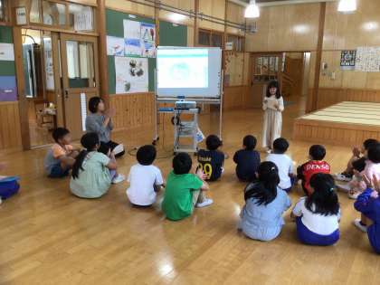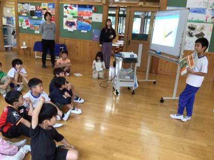 今日のプレイタイムはお話集会です。ワークスペースでは1、3年生が集まり、自分の頑張っていることや好きな教科、思い出などを話していました。