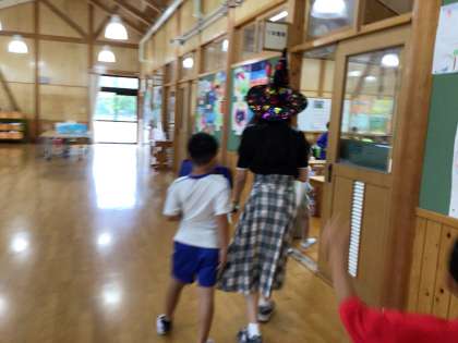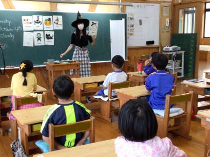 先生は、なんと魔女に扮して教室に登場。思わず子どもたちが笑顔になりました。