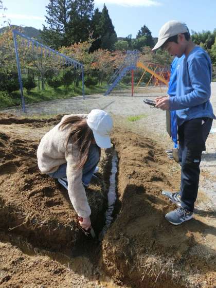運動場の土の山を山に見立て、川を作り、水を流しました。