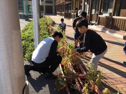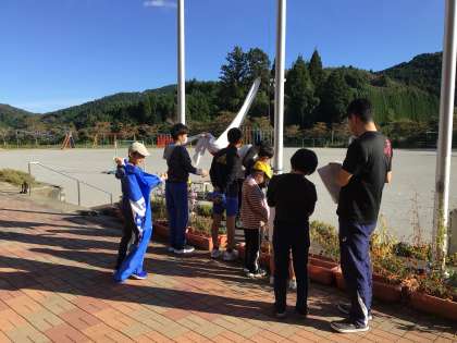 6年生の子が、5年生の子に校旗などの旗の掲揚の仕方を教えました。