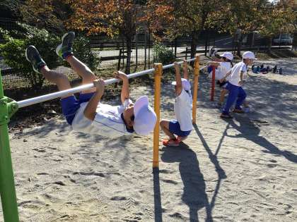 鉄棒にぶら下がって左右に1周回る地球周りや、逆上がりなど、一人一人が技を選択して練習していました。がんばって。