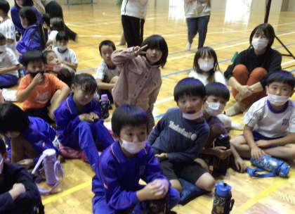下山中学校の体育館で、花山小、大沼小、滝脇小の子たちと合同で鑑賞しました。