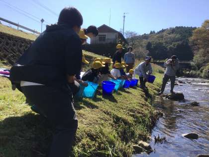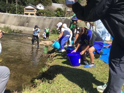 いよいよアマゴを放流します。アマゴが傷つかないように丁寧に川にはなしてあげました。子ども達から、「またねー」という元気な声が聞こえてきました。
