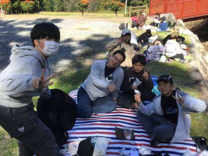 班ごとにお弁当です。どんな性格って言われる?好きな食べ物は?など、自然に自己紹介がはじまっています。