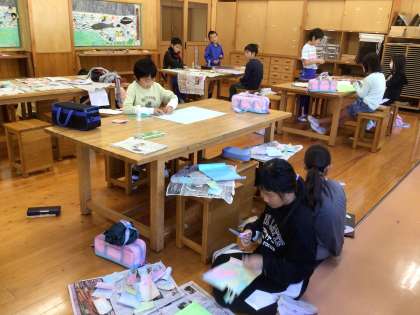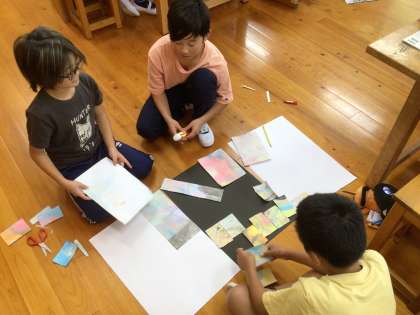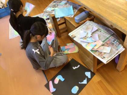 先週4年生は図画工作の時間にマーブリングに取り組みました。マーブリングとは、水に専用の絵の具を垂らして、水面で広がったり、混じりあったりしてできたマーブル模様を紙に写し取る技法です。今週はできた模様から思いついたものを、切ったり、絵を描いたりして思い思いに発想を広げて表現していきます。