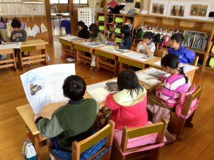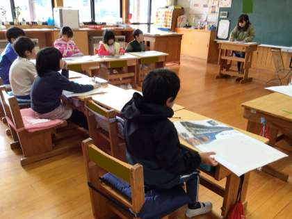 説明文の学習のまとめとして、乗り物について調べたことを作文に書き、イラストとともに画用紙にまとめました。