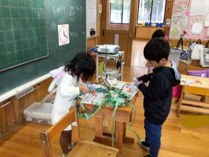 1年生が、畑で栽培したお芋のツルを巻いて、リースを作っていました。