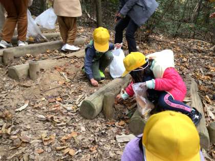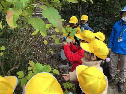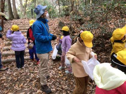 今日は1年生は校外学習で自然観察の森に出かけました。植物や昆虫の卵などいろいろな説明をしてもらいながら、後からの作品作りに使う葉っぱやどんぐりを集めてまわっています。