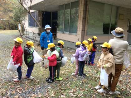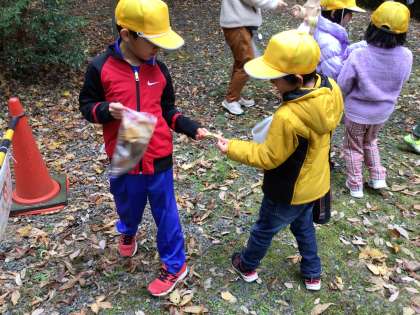 集めた葉っぱを使ってゲームを行いました。「大きい葉っぱ」「茶色い葉っぱ」などのお題が出されます。ペアをつくって、お題に近い葉っぱを探して、ジャンケンのようりょうで、見せ合います。どっちがよりお題に近いか⁉︎ 楽しそうです。