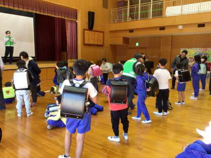 講師として地域安全指導員の方をお招きし、不審者に出会ったときの対処法について体験的に学びました。