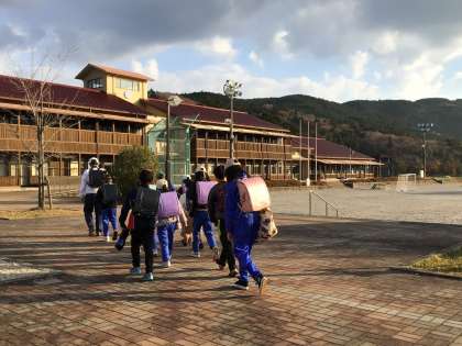 徒歩通学の子たちは、年末の交通安全市民運動のため登校指導をする先生と一緒に歩いてきました。