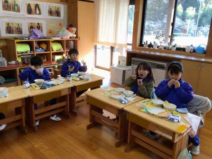 「今日は給食にデザートがついている!」子どもたちは、にこにこです。