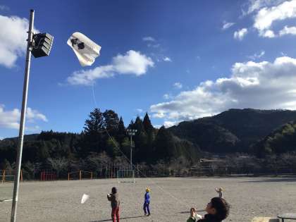 すぐに運動場に出て、凧揚げをしました。