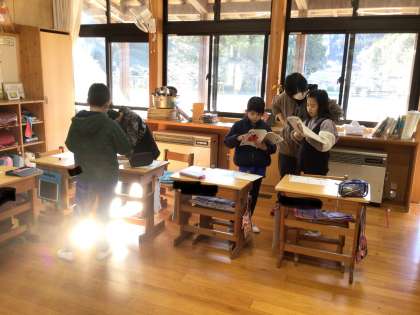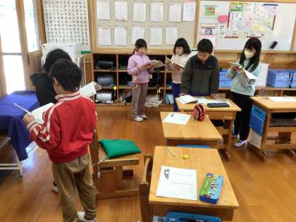 2年生は国語のかさこじぞうの読みの練習をしていました。友達と一緒に一生懸命練習していました。