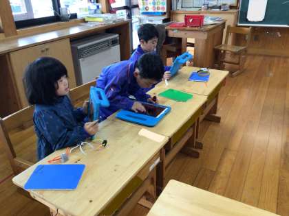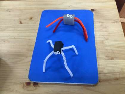 スポンジやモールを使ってすきまちゃんを作り、教室や廊下の隙間に置いて、タブレットで写真を撮りました。