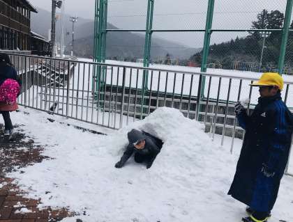 1年生の子は、高学年の子に作ってもらったかまくらに入って遊んでいました。