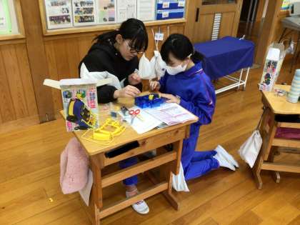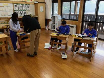 5時間目、5年生は理科の授業で電池で動く車作りに取り組んでいます。
