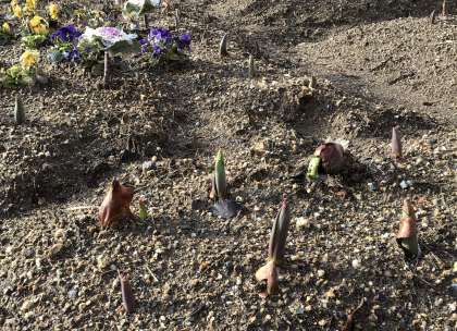 チューリップが芽を出そうと、冷たい土をのけ、球根の硬い皮を破っていました。