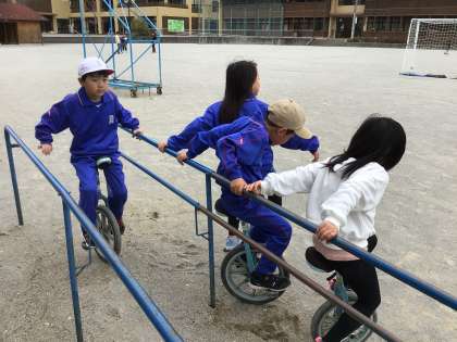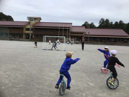 本年度初めての放課です。担任の先生とサッカーをする子、久しぶりに一輪車に取り組む子など、思い思いに楽しんでいました。