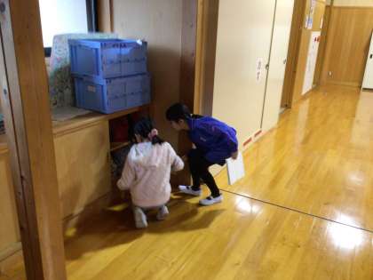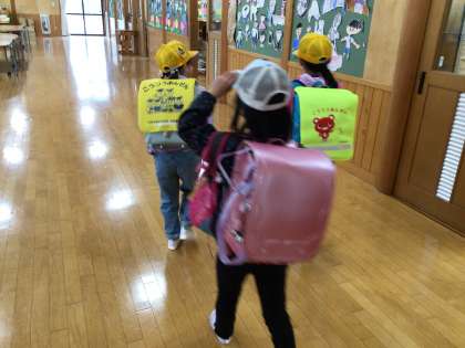 今日は避難訓練ということもあり、防災リュックを持ってきた子がいました。