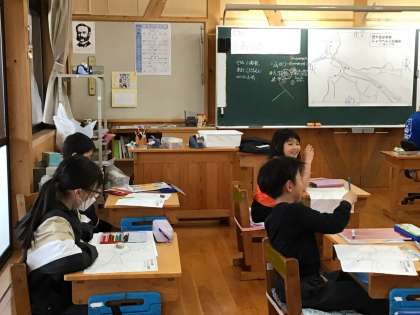 小学校やこども園、郵便局など、風景を思い浮かべて白地図に落とし込みました。
