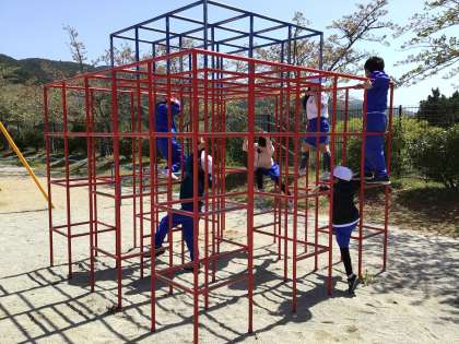 子どもたちは遊具が大好きです。この時間は、ジャングルジムが人気でした。