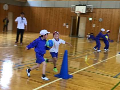 上の写真は、2チームにわかれて、ボール運びをした様子です。
