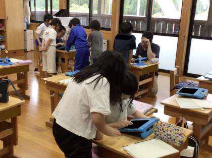 今日は、タブレットで学校や家の周りにある緑の看板の写真をクラスで共有しました。