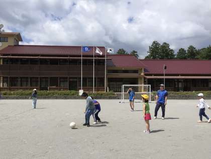 ドッジボールやサッカーは、学年をこえて、みんなで遊びます。先生も一緒になって遊びます。